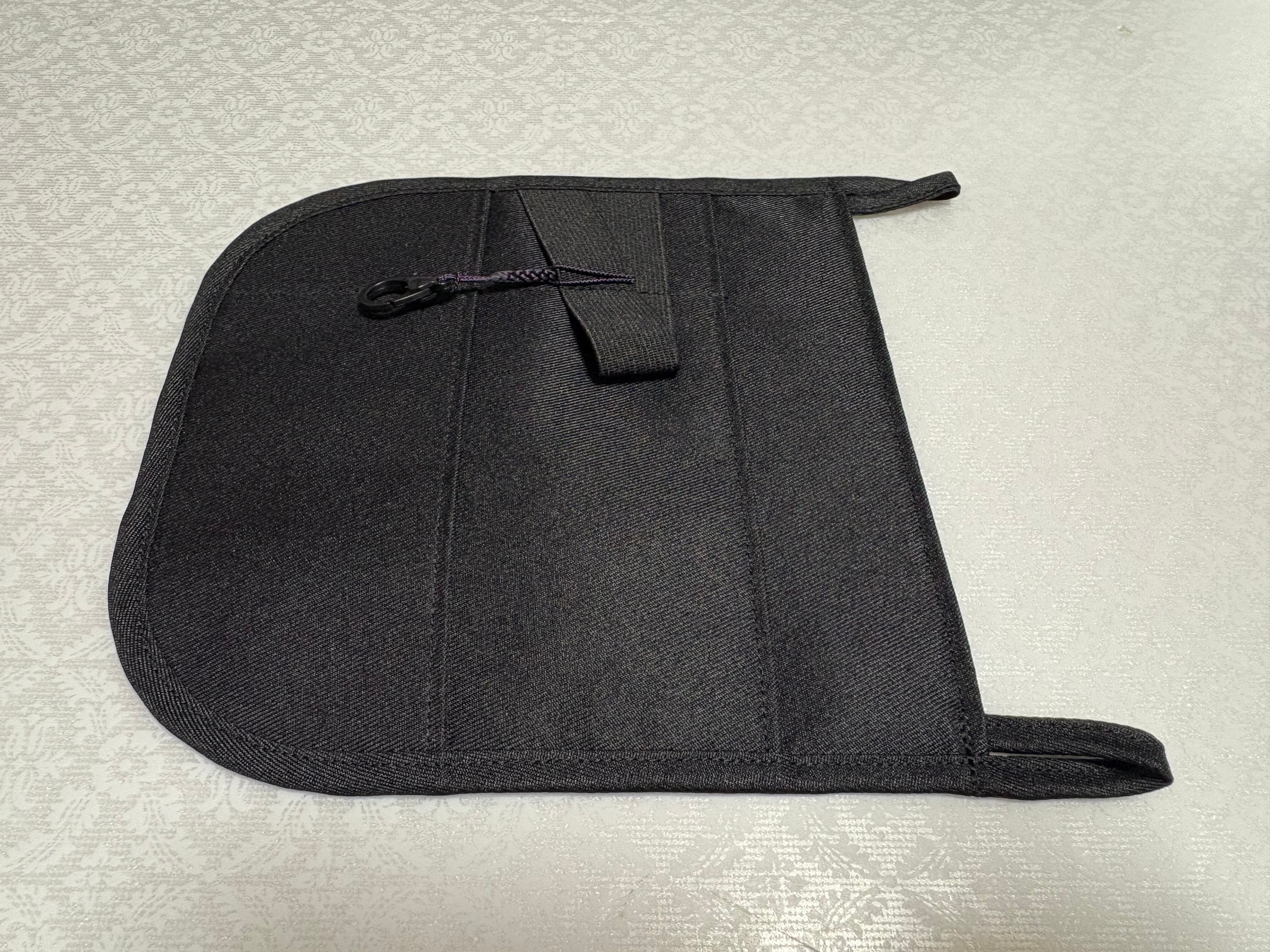 マチをつけていませんのでペタンコ、厚みがないため着付け中邪魔になりません。狭いお部屋での着付けで前後に移動する際、お客様やお召しのお着物に着付師ポーチをぶつけてしまうこと、擦ってしまうことがないため安心です。